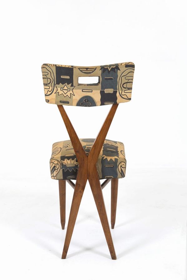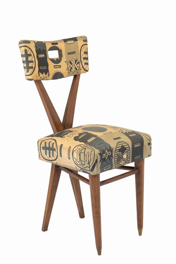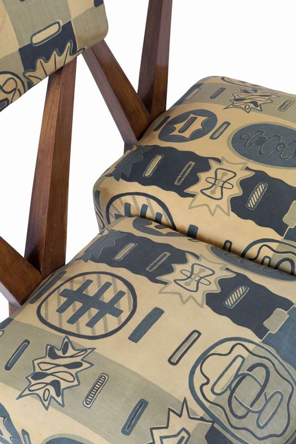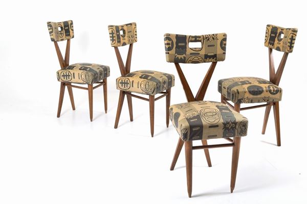 Four wooden chairs with important contemporary fabric. 1950s.