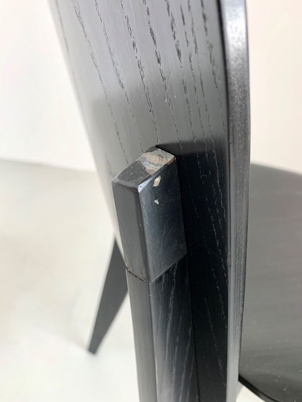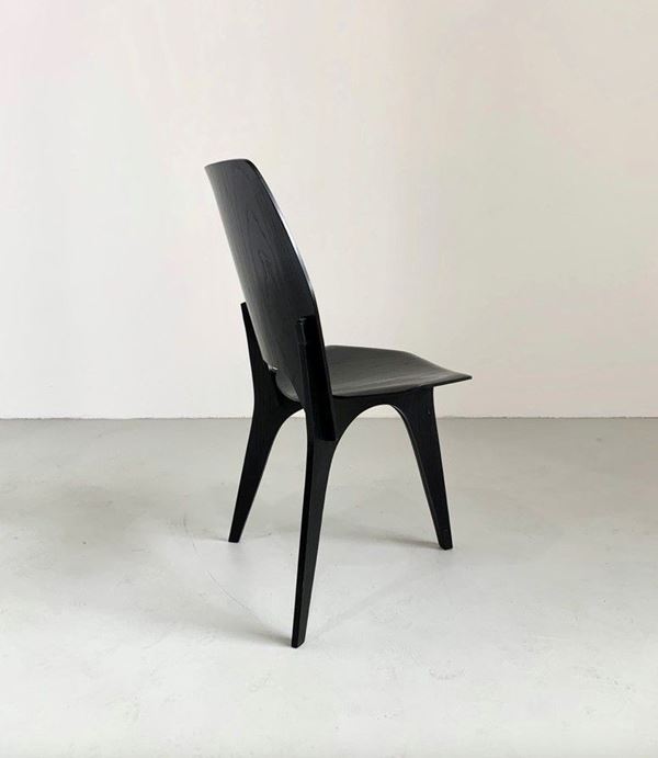 Four chairs in black lacquered teak. TECNO production. & Nbsp; 1950s. Published in A new chair, Domus, February 1959, p.51 and in Irene de Guttry and Maria Paola Maino, The Italian Furniture of the 40s and 50s, Rome, 1992, p.183. Small flaws.