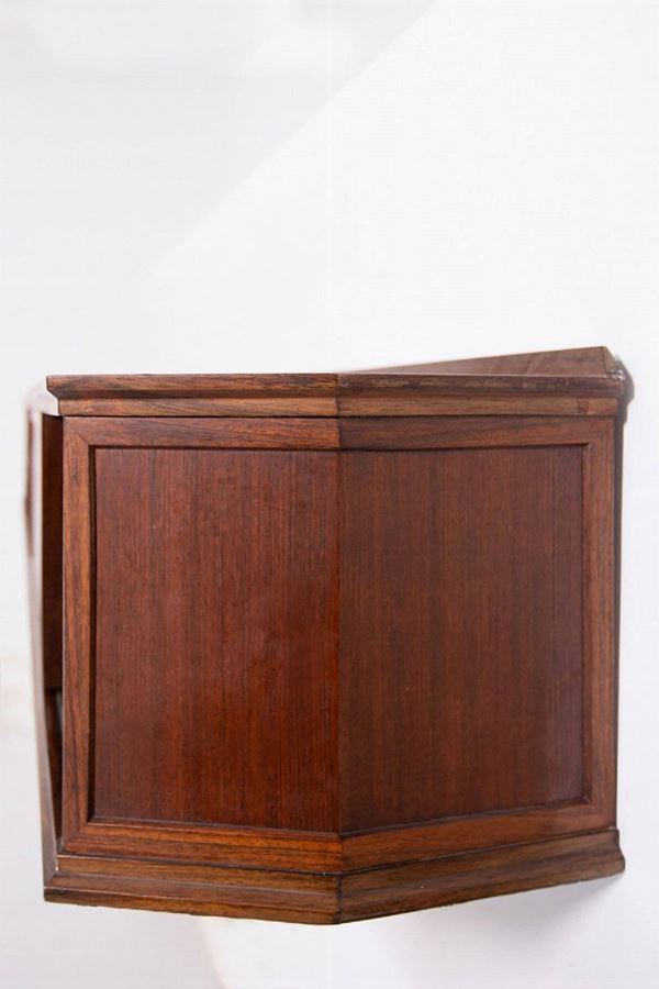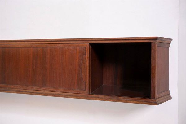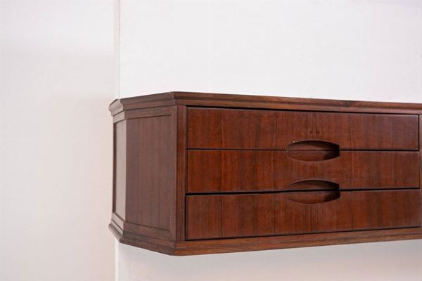 Wall-mounted console in precious wood with three drawers and three storage compartments with sliding opening. 1950s.