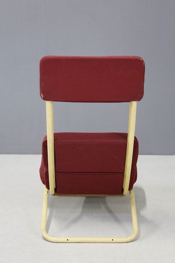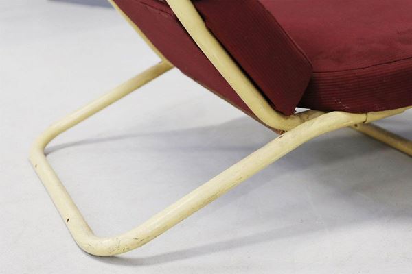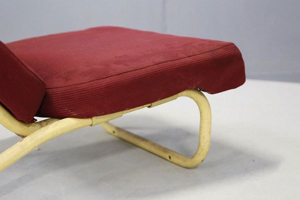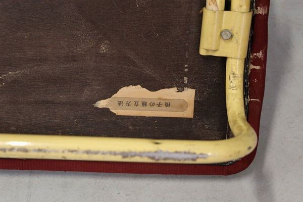 Japanese armchair in yellow tubular metal and removable cushions in original brick red fabric. With label in Japanese characters under the seat. 1950s. Defects.