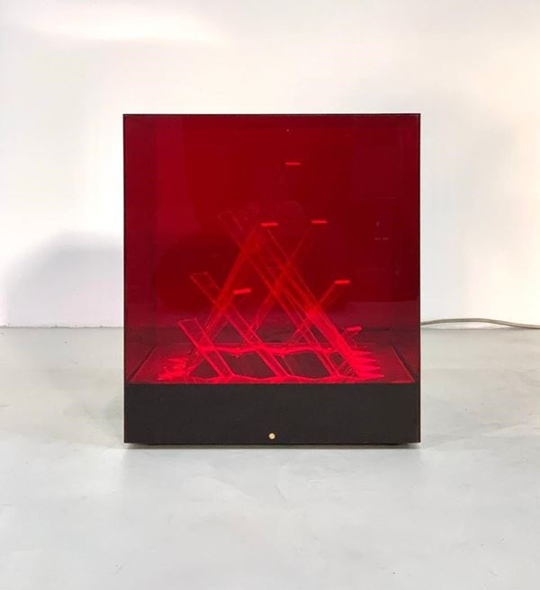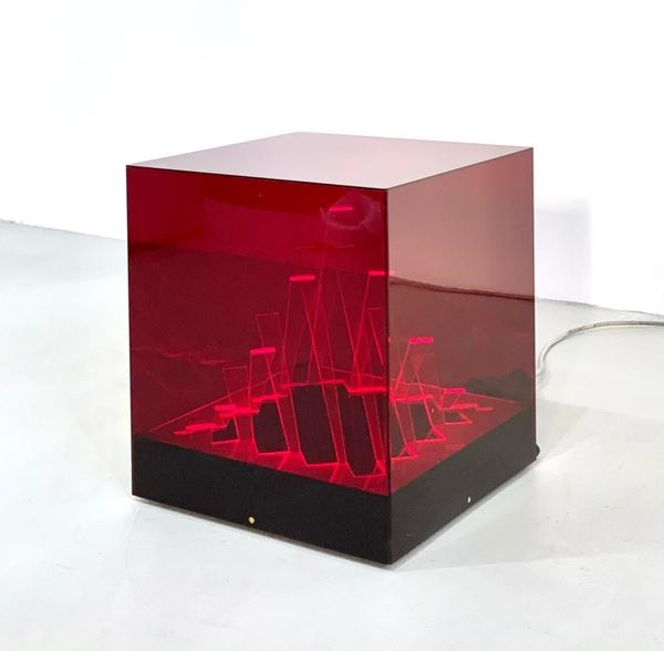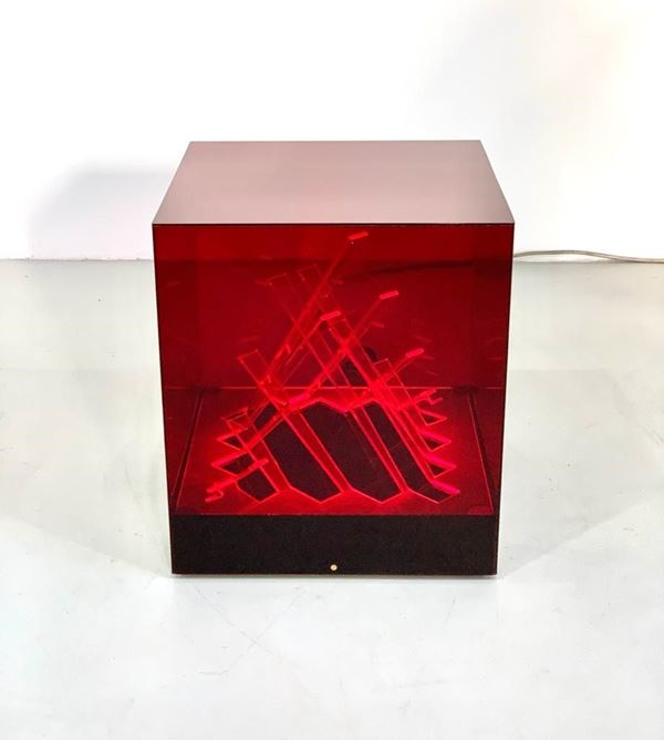 Cubo table lamp by Teo in red polymethylmethacrylate. Production RESEARCH CENTER ART INDUSTRY LISSONE 1960s.