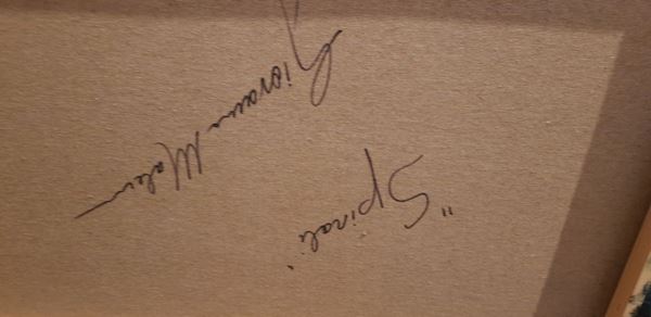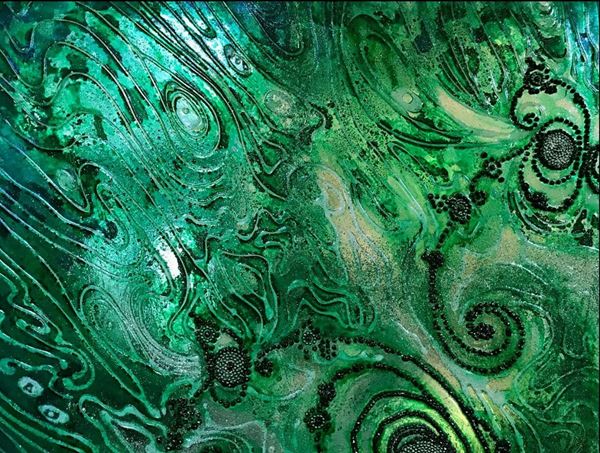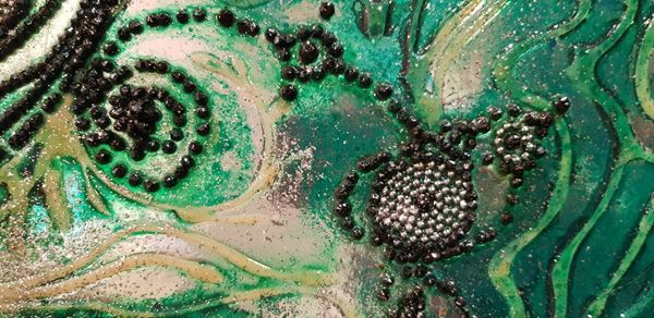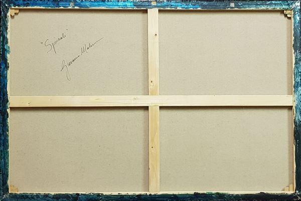 Mixed technique on canvas with resins in slight relief, beads and silver titled '' SPIRALS ''. Signed and titled on the back.