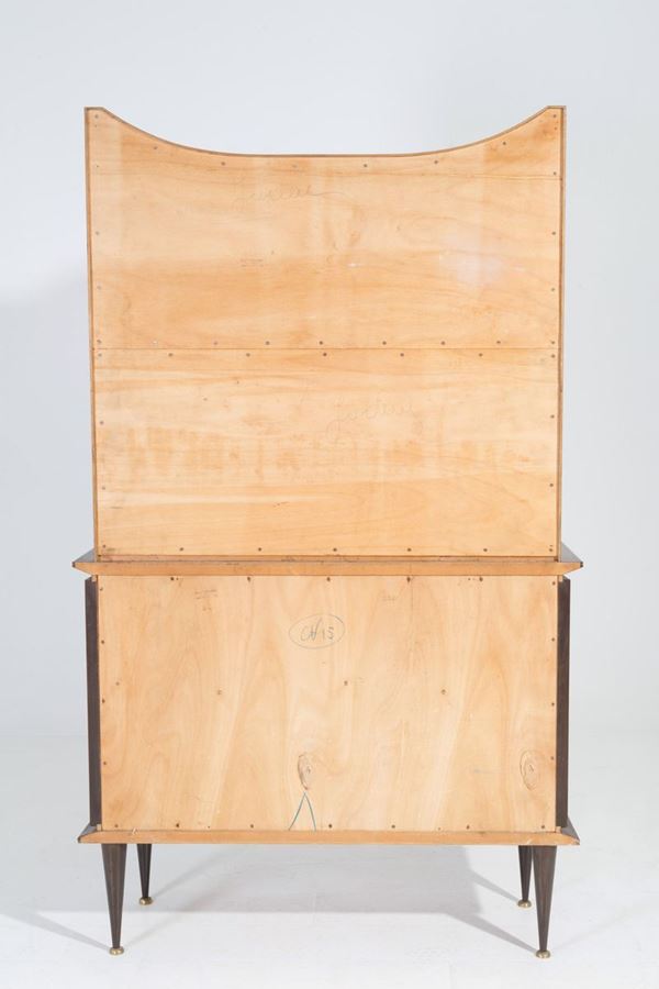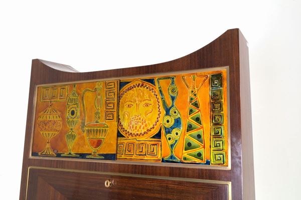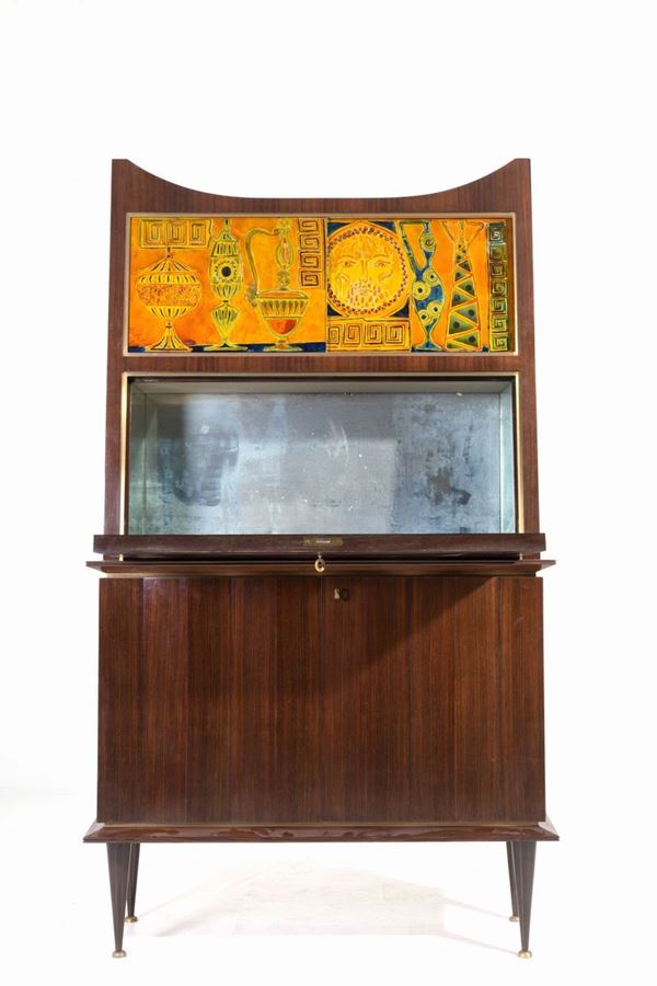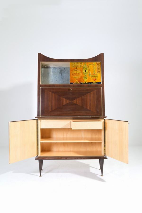 Cabinet in noble wood and painted glass with flap top. 1950s.