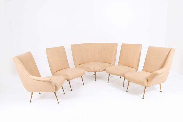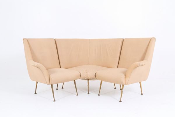 Modular corner sofa with six elements in brass and sky. Italian manufacture. 1950s. Defects.