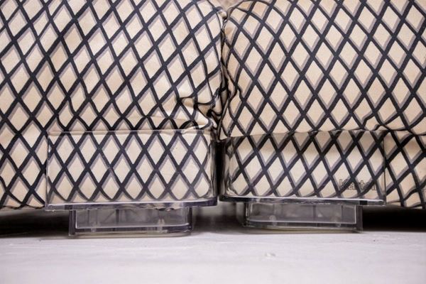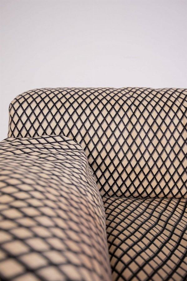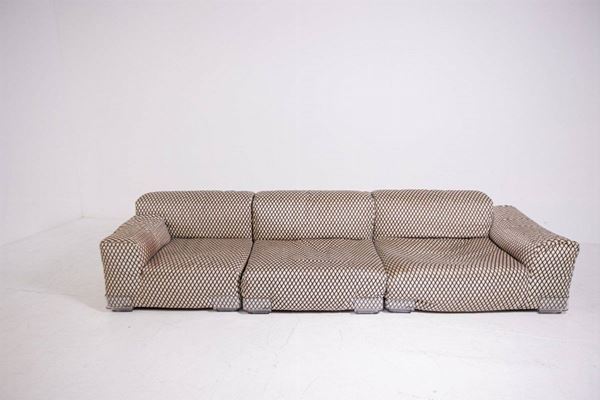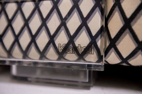 Rare Memphis three-seater modular sofa in mesh fabric. With manufacturer's mark on the plexiglass feet. KARTELL production. 2000s. Mis. total length cm. 298 Height cm. 64 Depth cm. 89. approx. left armchair cm. 90 approx. central armchair cm. 88 approx. right armchair cm. 120 approx.