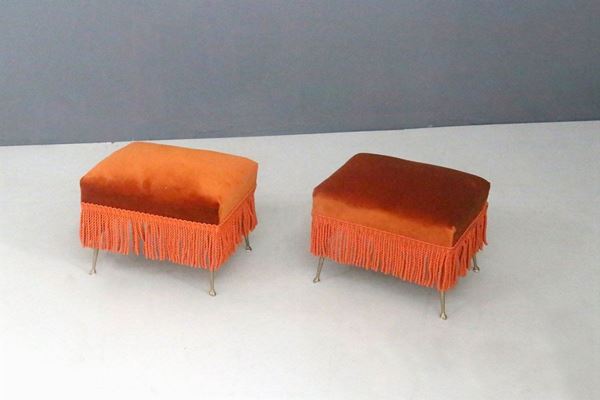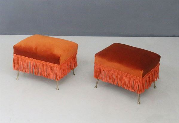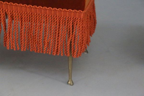 Pair of poufs in orange velvet with fringes and brass. 1950s.