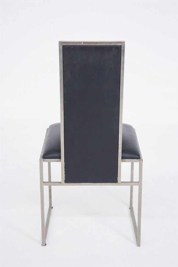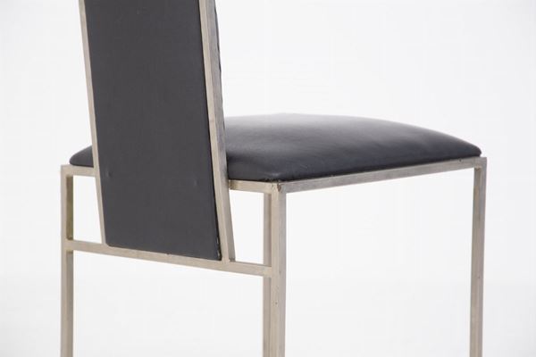 Six chairs with black leather seat and metal structure. 70's. Defects.