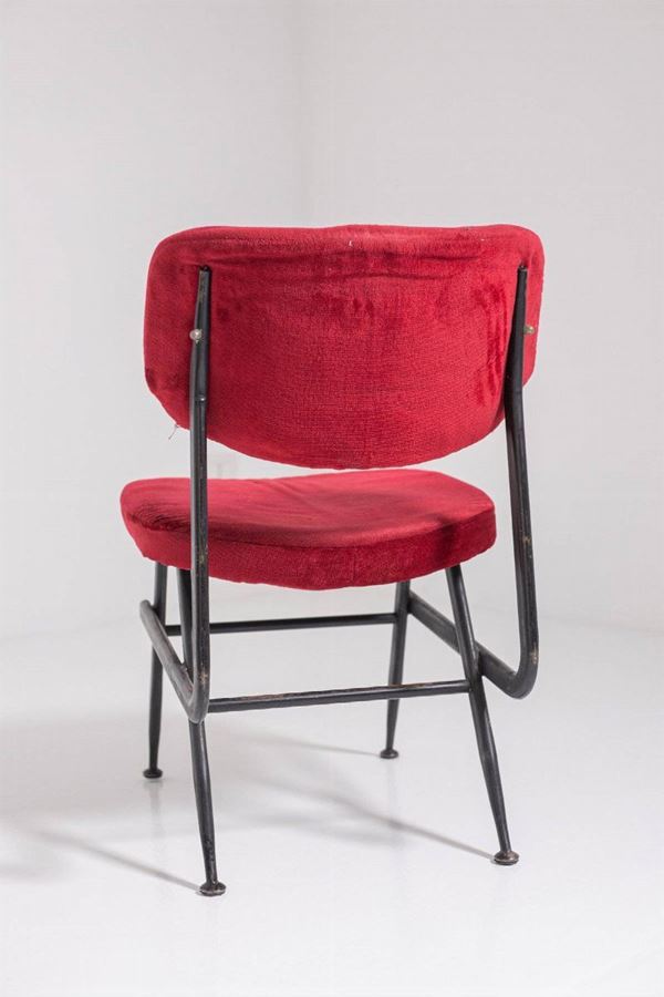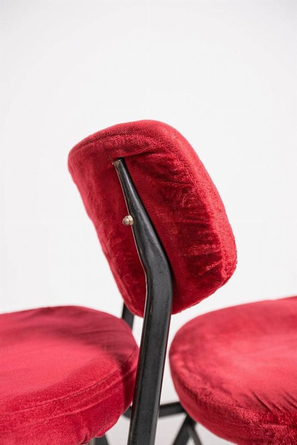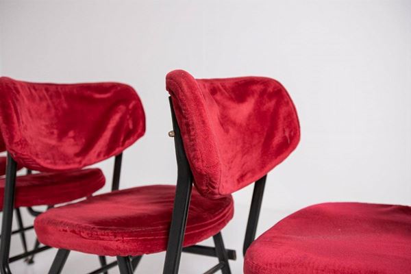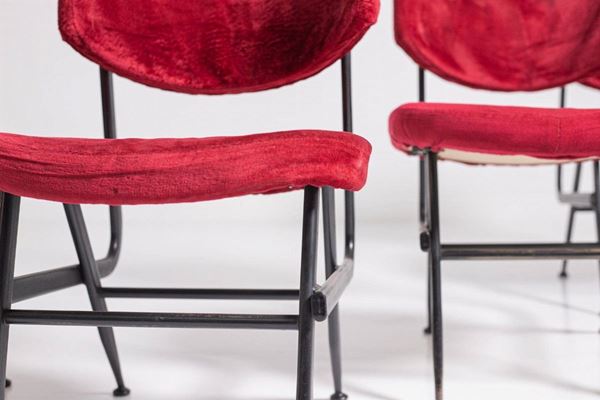 Six chairs in black painted iron with brass tips and seats and backs in original dark red velvet. Italian manufacture. 1950s.