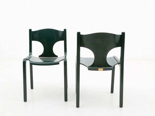 Six chairs in green lacquered wood. WELLS production. 1960s-1970s. Defects. Seat height cm. 45 approx.