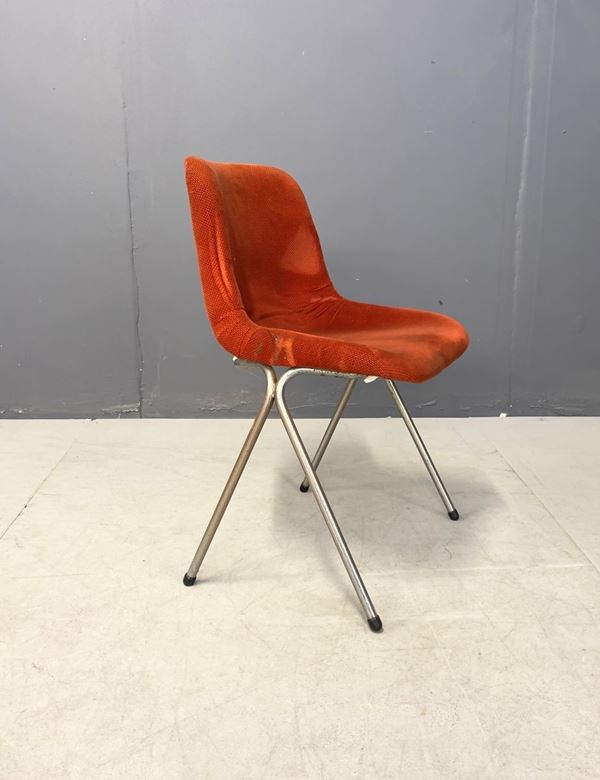 Six chairs in chromed metal, plastic material and upholstery in red fabric. Italian manufacture. 60's. Signs of wear.