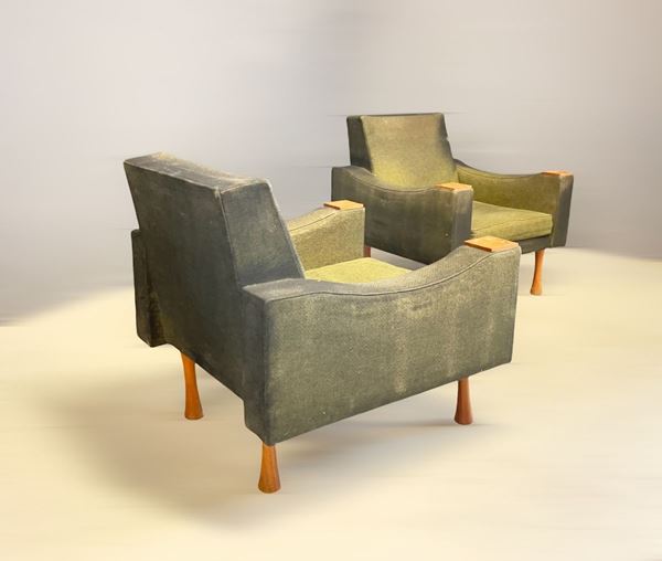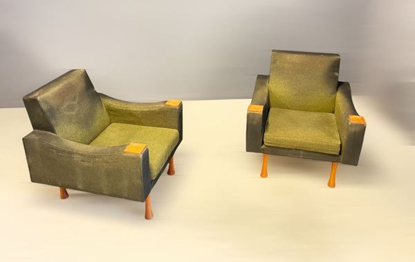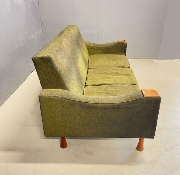Sofa and two wooden armchairs with original fabric upholstery. 1950s. Sofa measures: Height cm. 60 Width cm. 190 Depth cm. 80 about Armchair measurements: Height cm. 80 Width cm. 80 Depth cm. 80 approx.