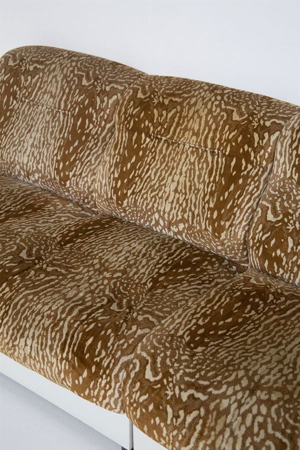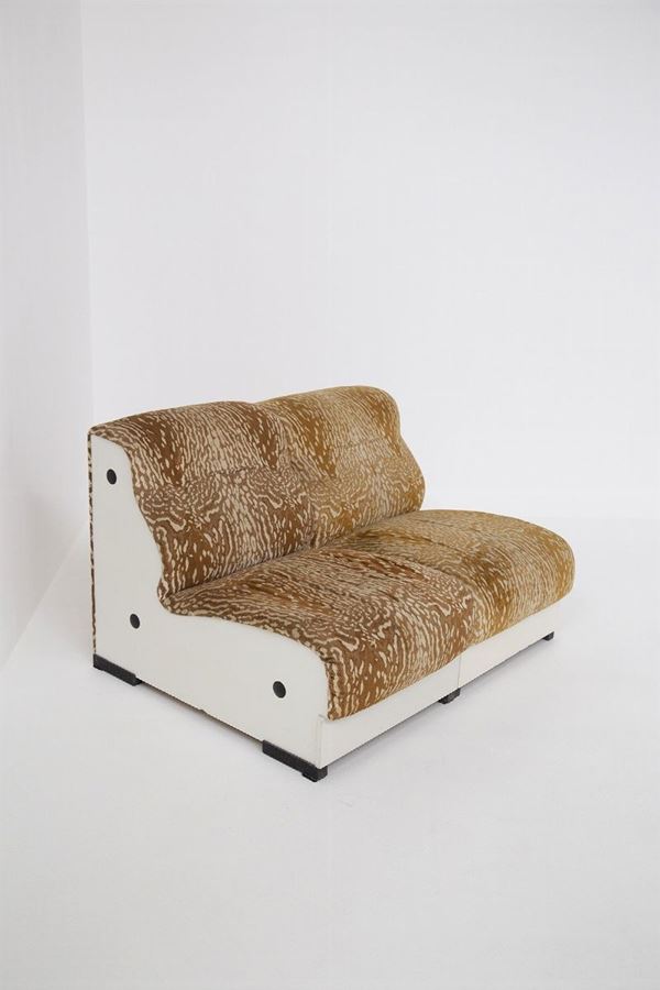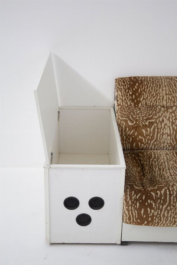 Space Age sofa composed of two modules, one three-seater and the other two-seater, in wood and original fabric completed by three speakers, one central and two side, for amplifiers. Italian manufacture. 70's. Mis. three-seater sofas: Lung. cm. 168, Height cm. 67, Prof. cm. 90 approx. two-seater sofa: Length. cm. 112, Height cm. 67, Depth approx. 90 cm Mis. cabinet with stereo speakers Lung. cm. 40, Height cm. 50, Prof. cm. 90 approx. central cabinet: Length. cm. 90, Height cm. 47, Prof. cm. 90 approx.