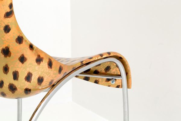 Two Silicon Hill resin chairs with chromed metal legs, one leopard and one zebra. TECNO production. 1996.