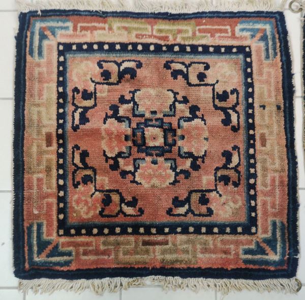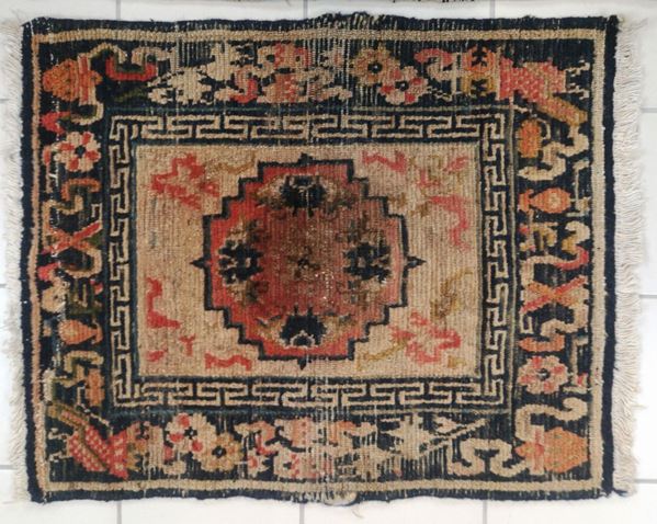 Gruppo di quattro tappeti. Tre sedute e un tappeto Suiyan in lana. Tibet. XIX secolo. Misure seduta uno: Alt. cm 65 Larg. cm 52Misure seduta due: Alt. cm 61 Larg. cm 58Misure seduta tre: Alt. cm 62 Larg. cm 58Misure tappeto: Alt. cm 119 Larg. cm 66
