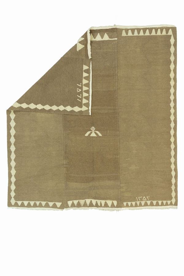 Kilim Bidjar in lana di cammello a tre pannelli. Datato 1352 (1971 d.C.). Persia. Perfetto stato di conservazione.