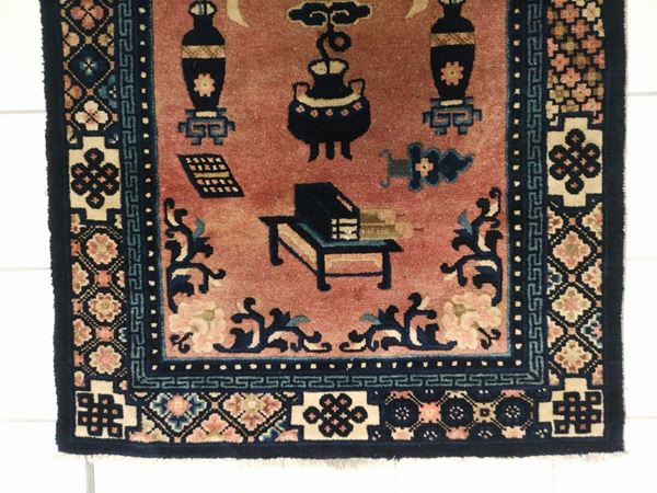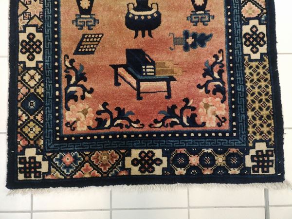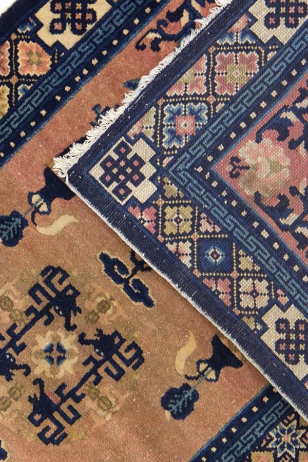 Tappeto Suiyan in lana. Tibet. Inizi XX secolo. Ex collezione The Te-Chun Wang. Ottimo stato di conservazione. Variazione di colore sul campo.