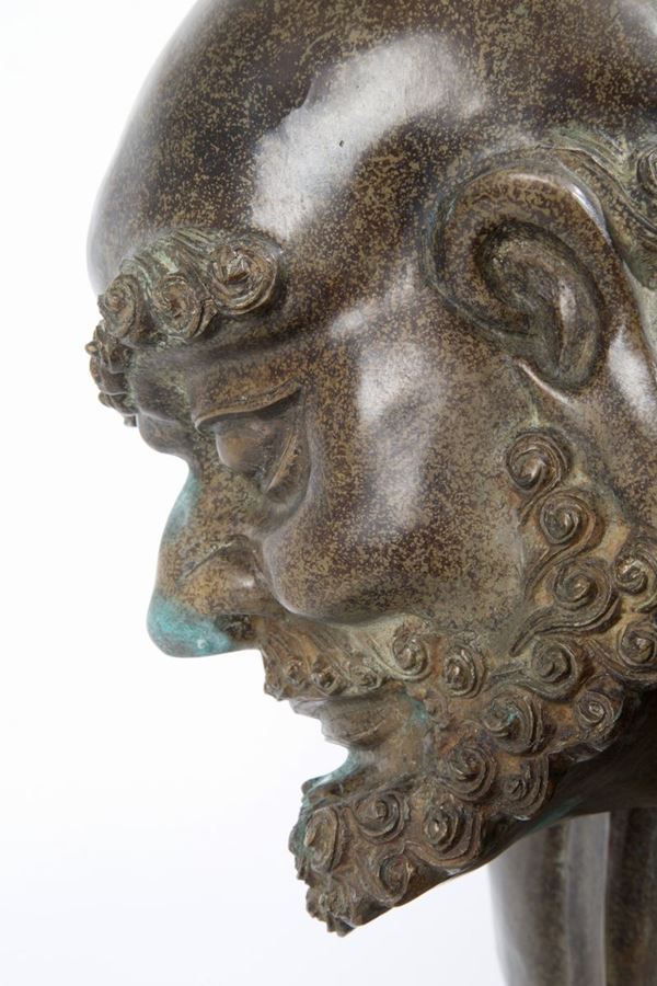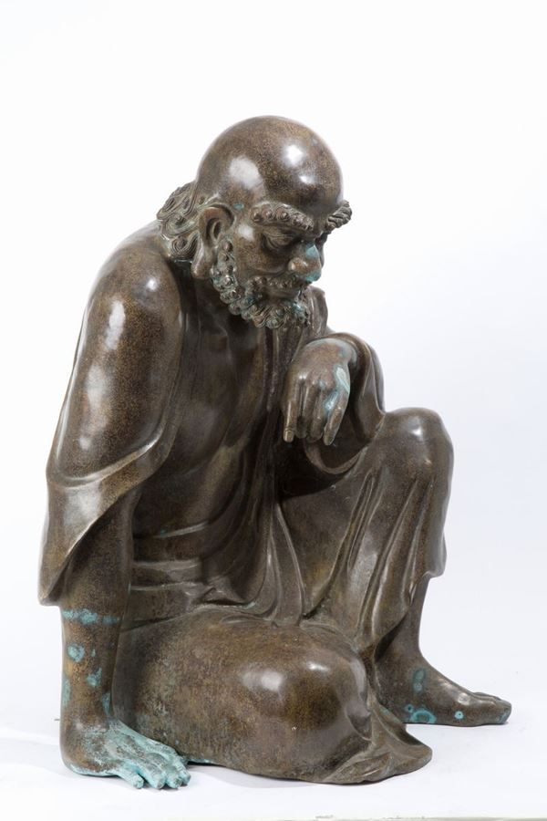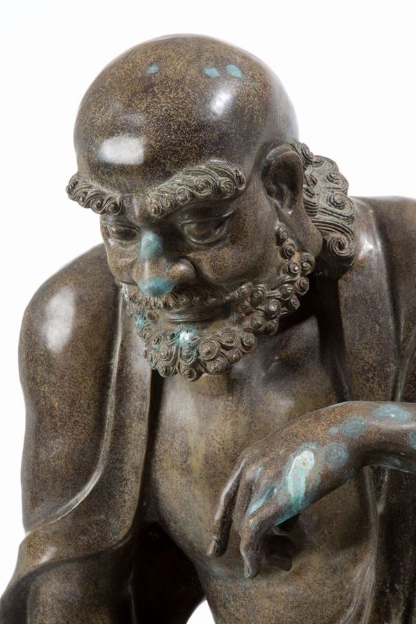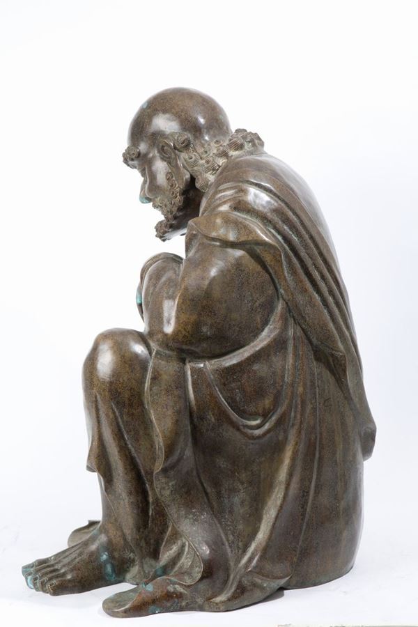 Patinated bronze sculpture raff. "SANTONE SEDUTO". China. & Nbsp;