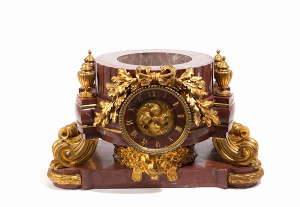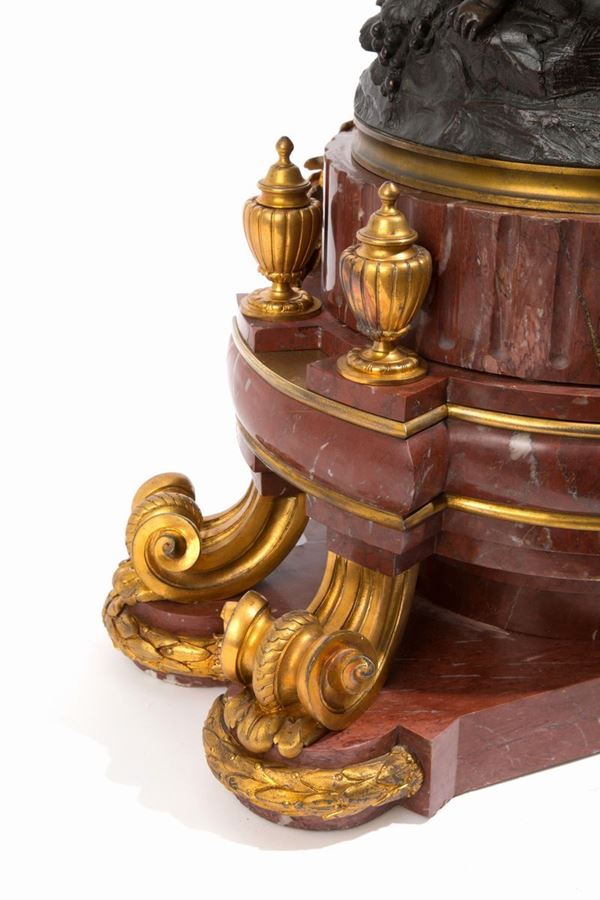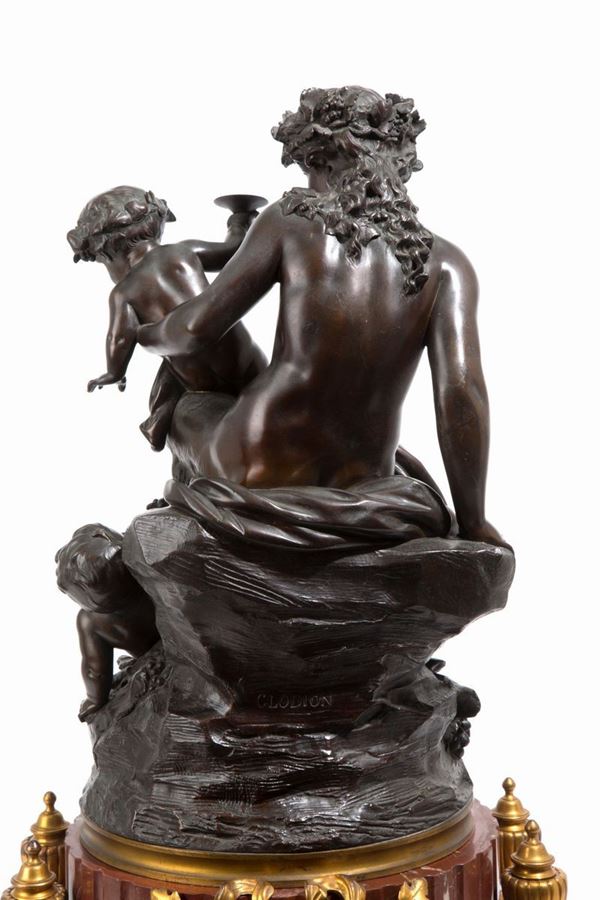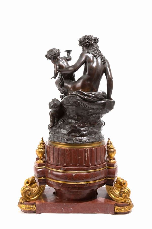Griotte red marble clock with chiseled and gilded bronze finishes. Surmounted by a burnished bronze sculpture raff. '' FAUNI ''. Signed on the back. France. & Nbsp;