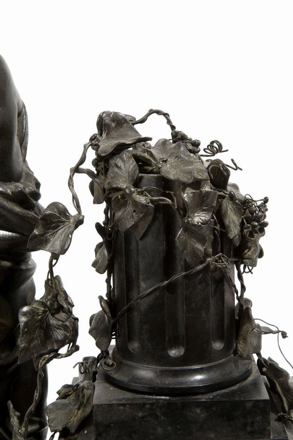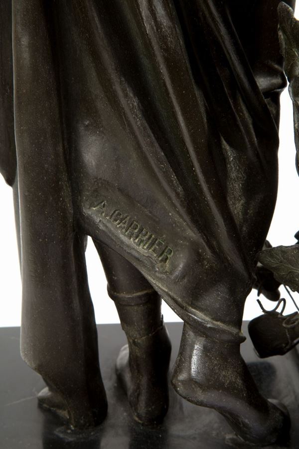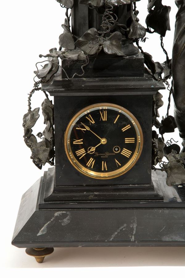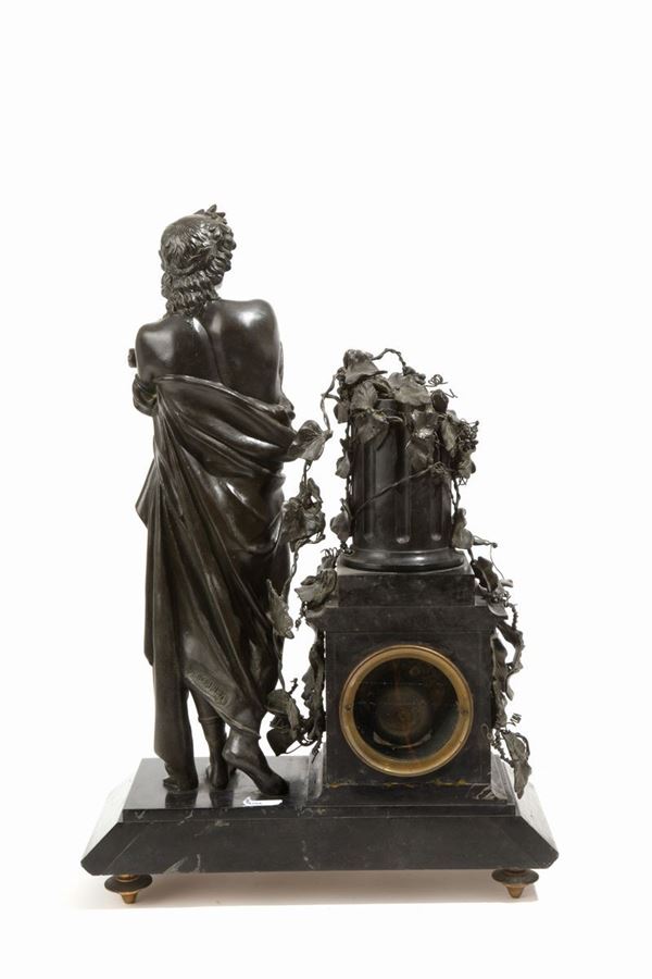 Black marble clock with antimony sculpture. Signed A. CARRIER on the back.