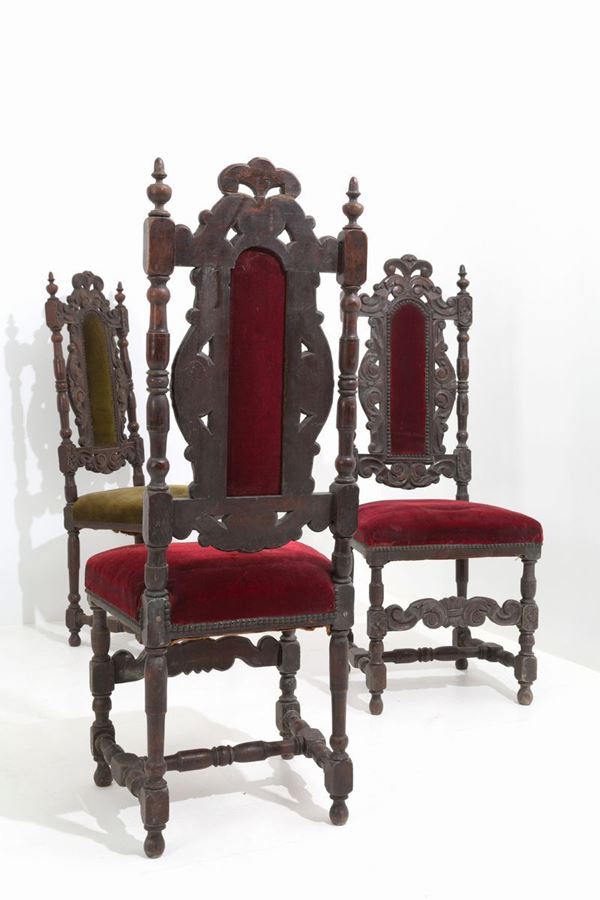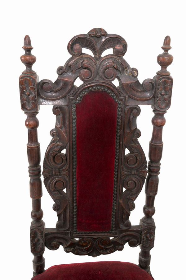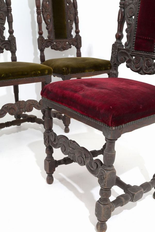 Four chairs in carved oak wood, turned spool leg. Holland. Nineteenth century.
