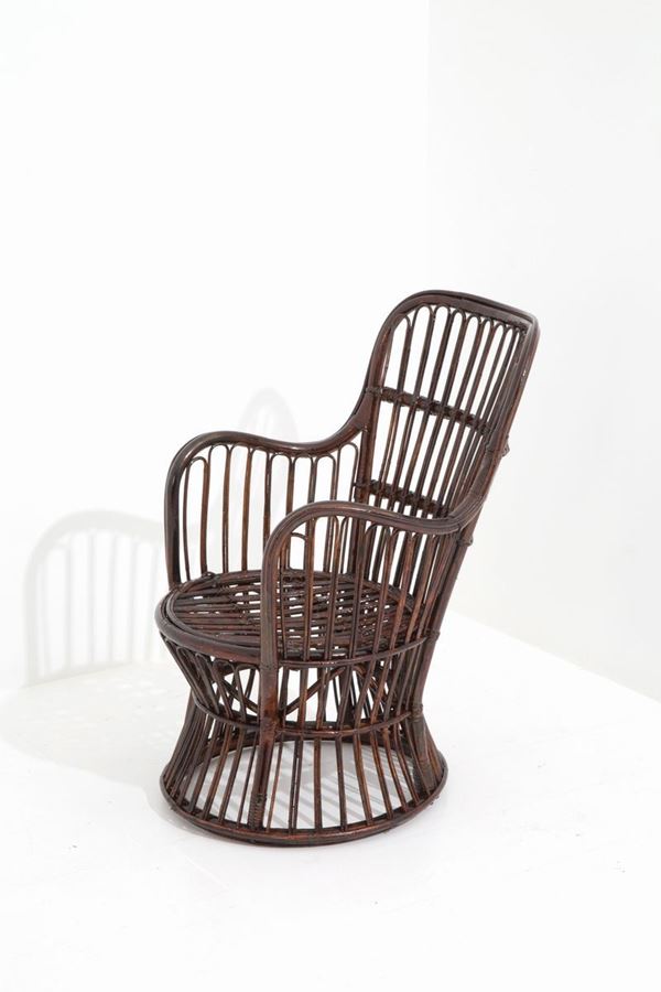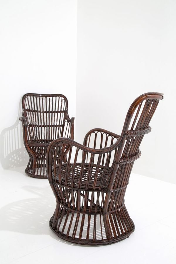 Bamboo lounge consisting of three armchairs (approx. 80x60x60 cm) and a coffee table (approx. 64x58 cm). 1980s.