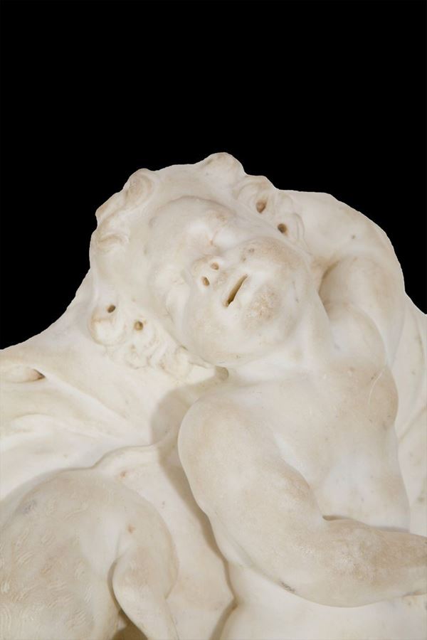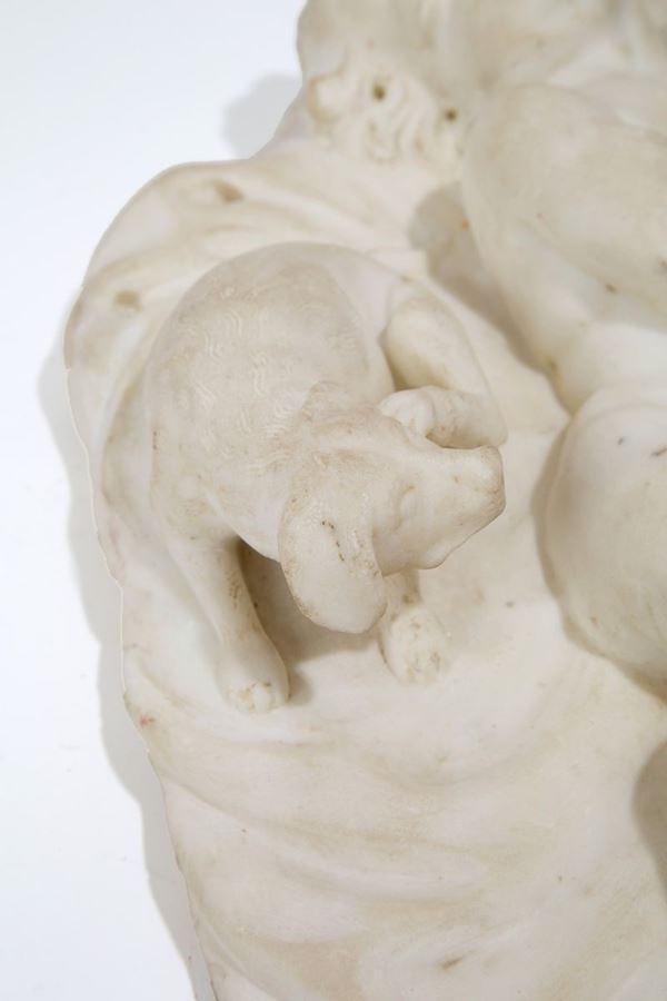 Carrara white marble sculpture raff. '' CHERUB SLEEPING WITH DOG ''. XVIII century.
