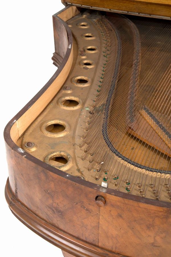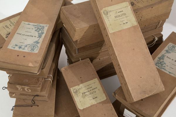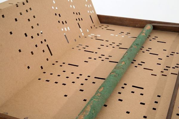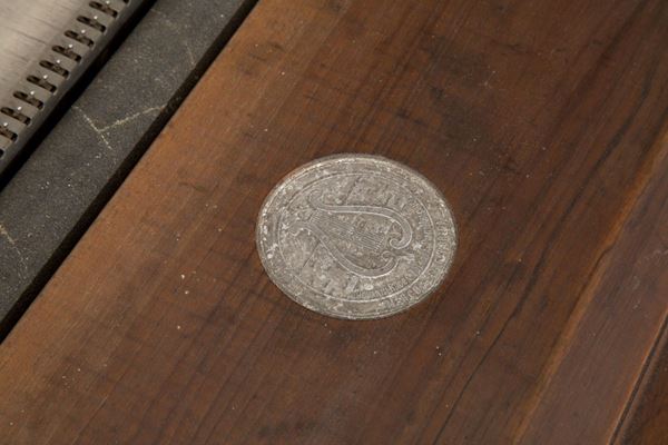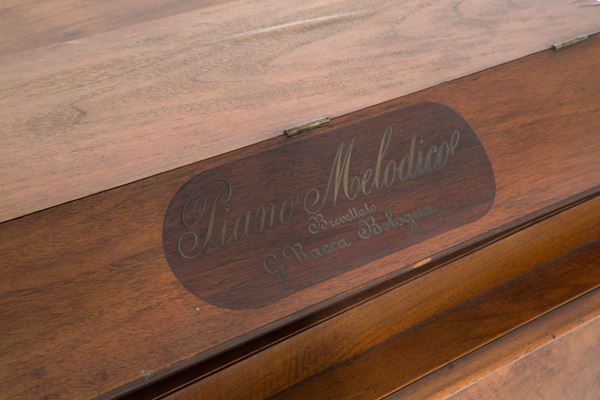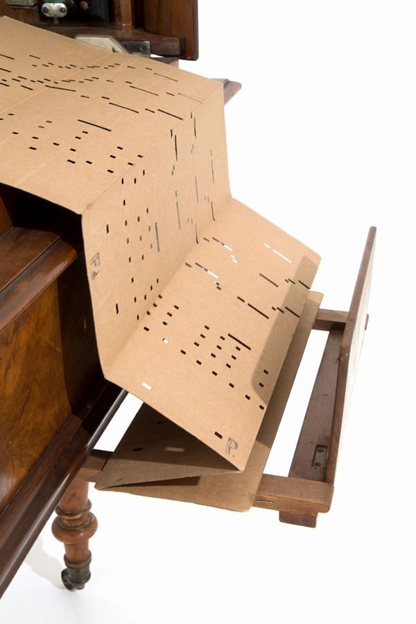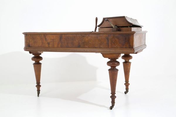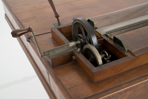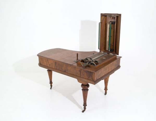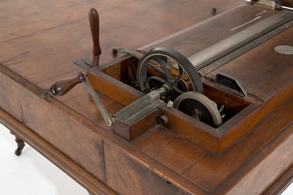 Melodic top in walnut wood model Excelsior, patented by GIOVANNI ROCCA, with twenty-eight original packaged music cards. Bologna. Late 19th century.