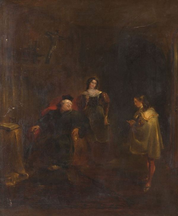 DUTCH SCHOOL OF THE EARLY XIX CENTURY. Oil painting on canvas raff. '' INTERIOR SCENE WITH PRIEST AND CHARACTERS ''. In frame.