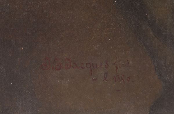 Oil painting on canvas raff. '' SELF PORTRAIT OF PAINTER ''. Signed J. J. JAQUES and dated 1890 in the lower left.