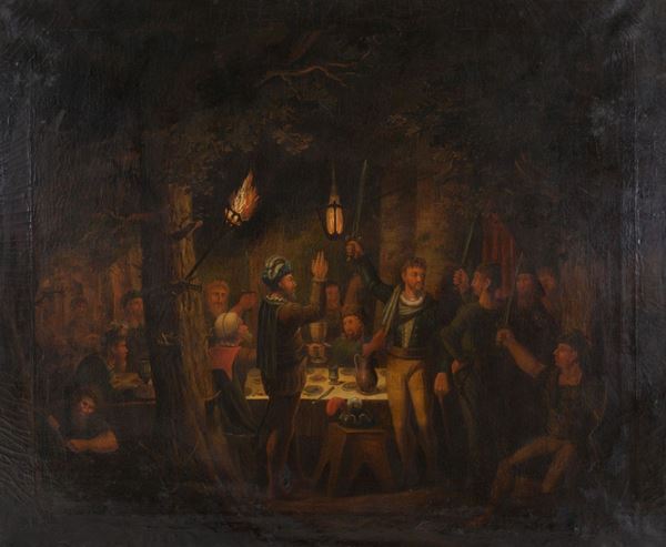 19th CENTURY DUTCH SCHOOL. Oil painting on canvas raff. '' PARTY WITH SWORDSHIPS ''. In frame.