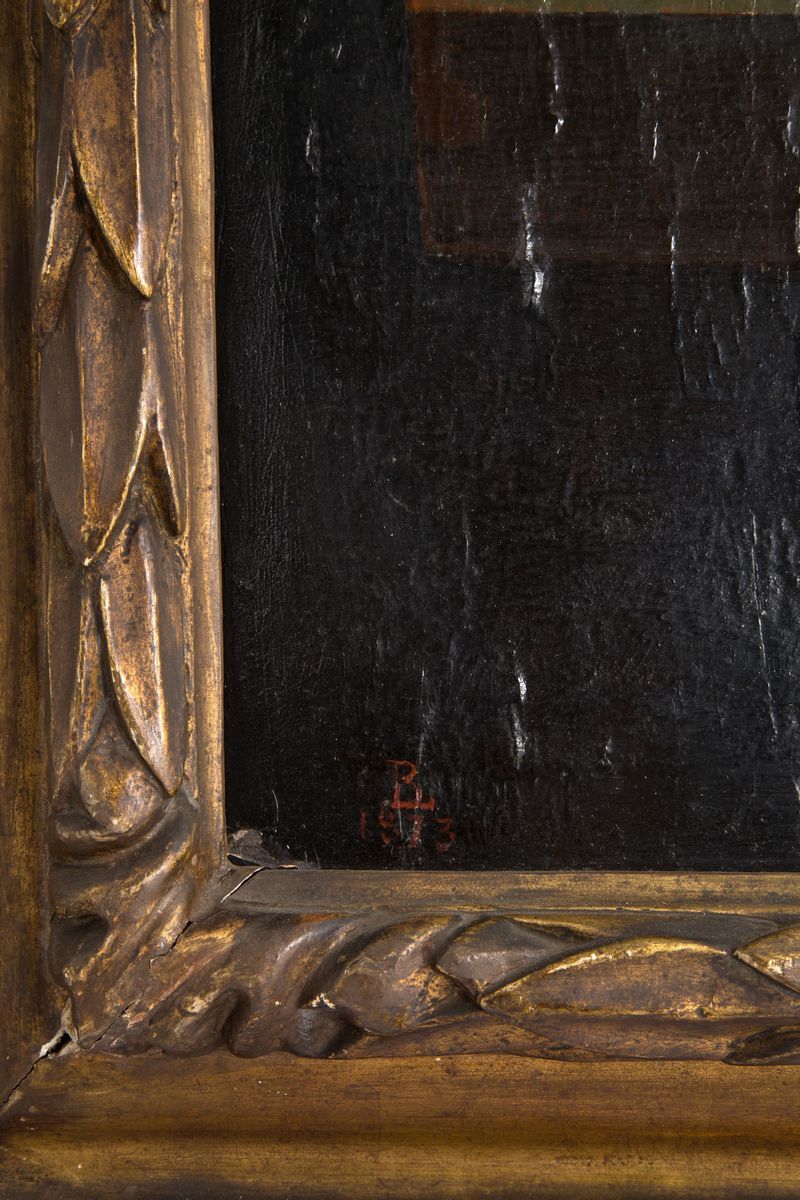 Oil painting on wood raff. '' STILL LIFE WITH HUNT ''. Signed B and dated 1873 in the lower left corner. In carved and gilded frame.