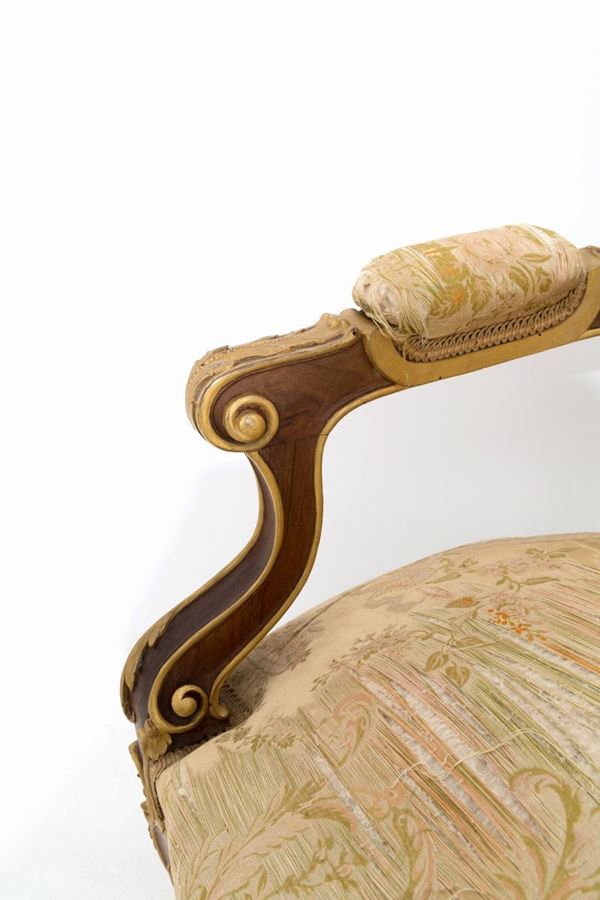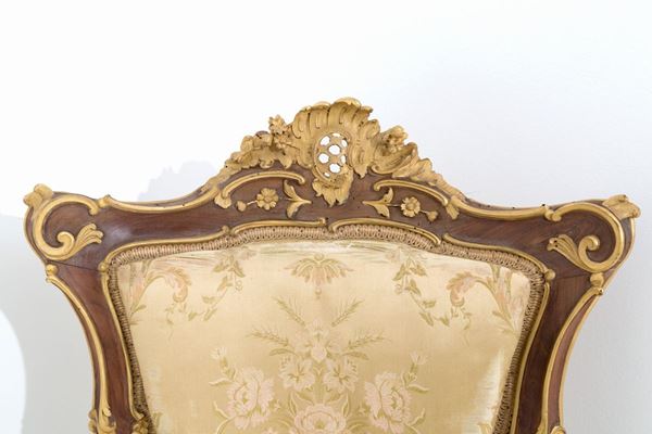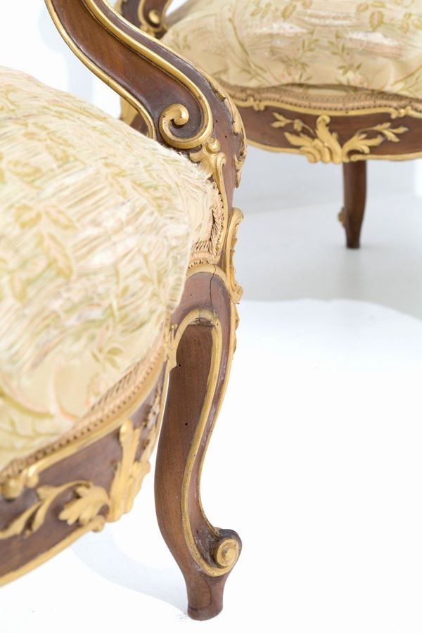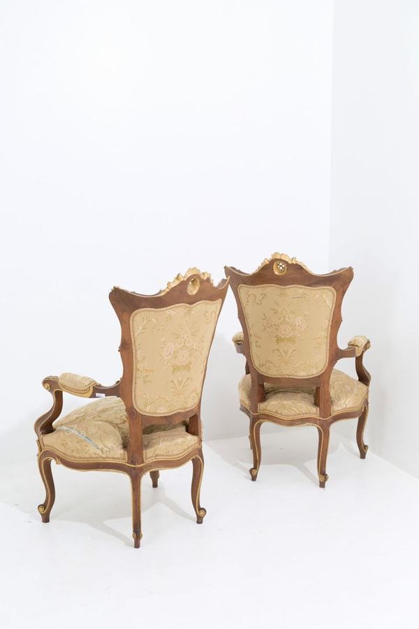 Pair of armchairs in lacquered, carved and gilded wood with upholstered back and seat. Umbertino period. Late 19th century.