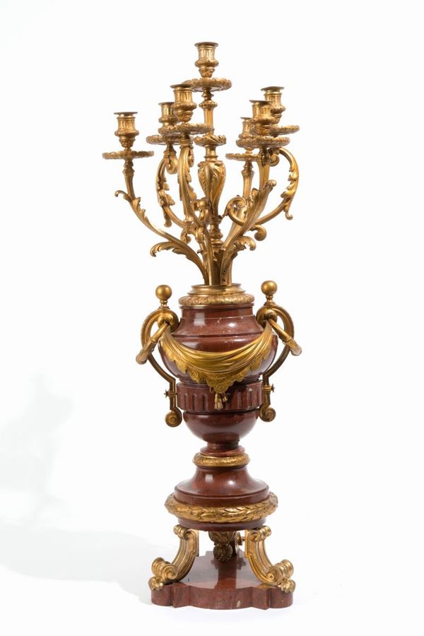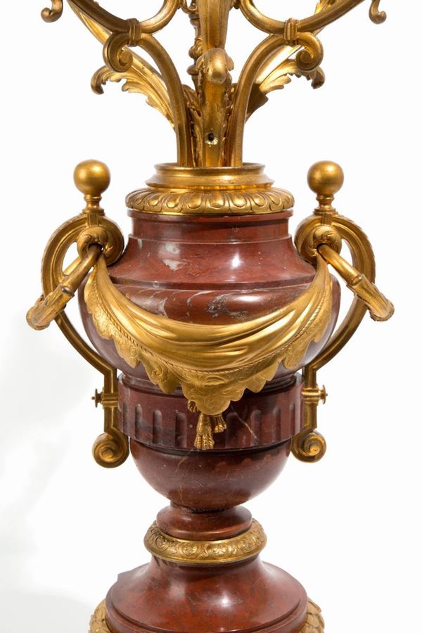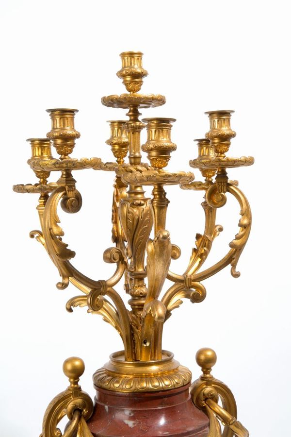 Pair of seven-flame candelabra in gilded and chiseled bronze. Griotte red marble base. France. Nineteenth century.