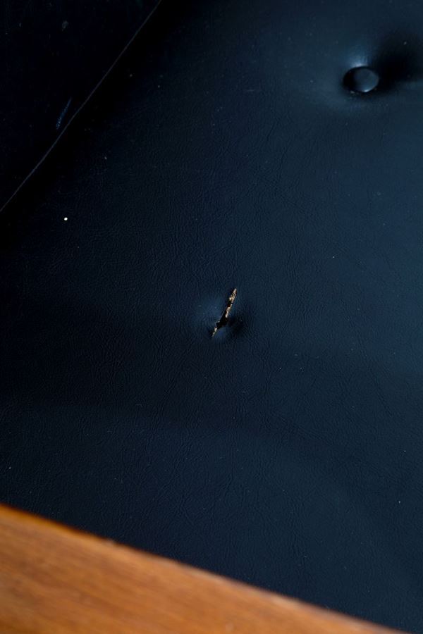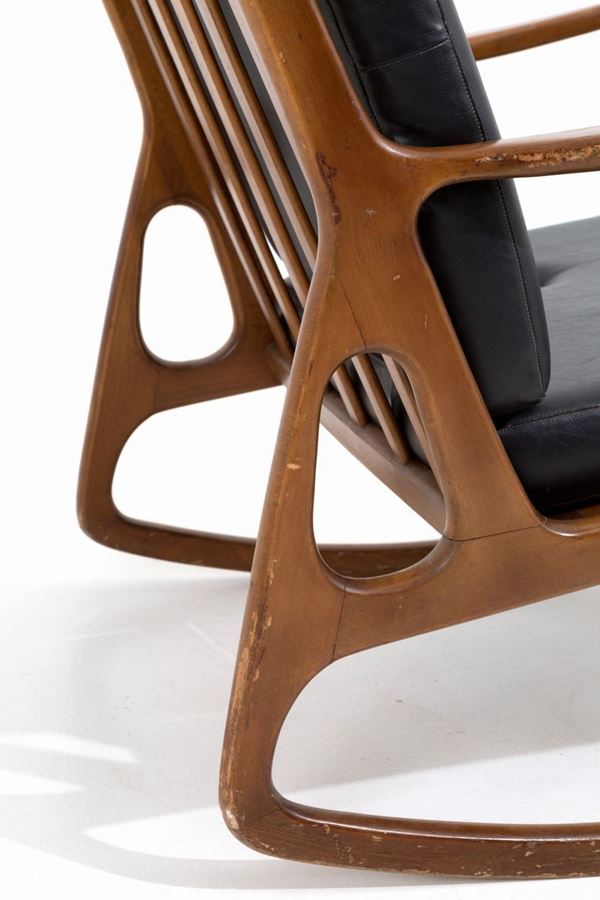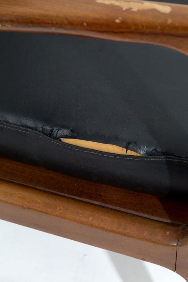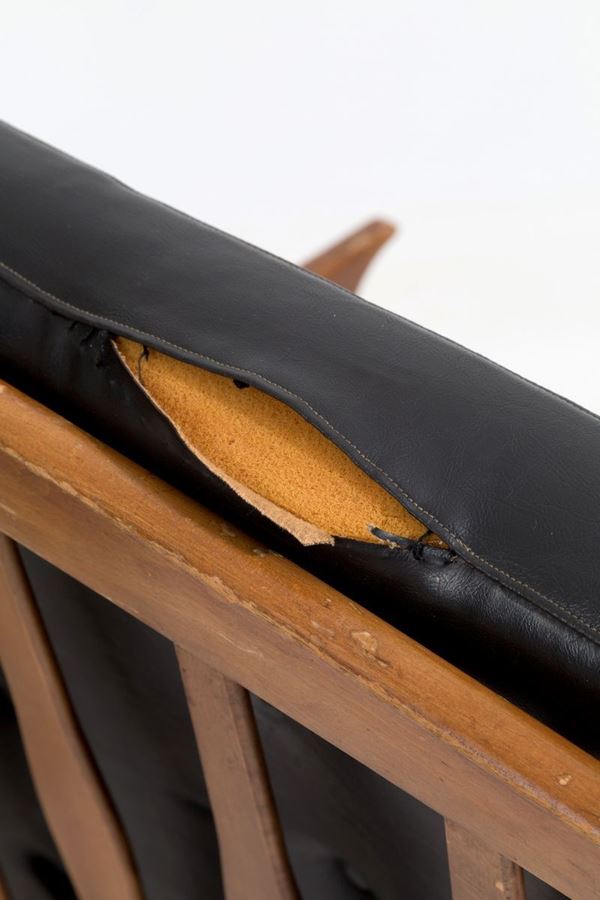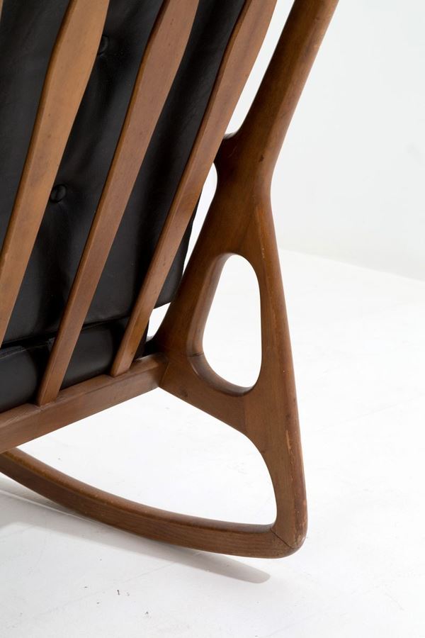Rocking chair in wood with black leather cushions. 20th century. Defects and shortcomings.