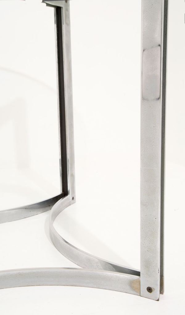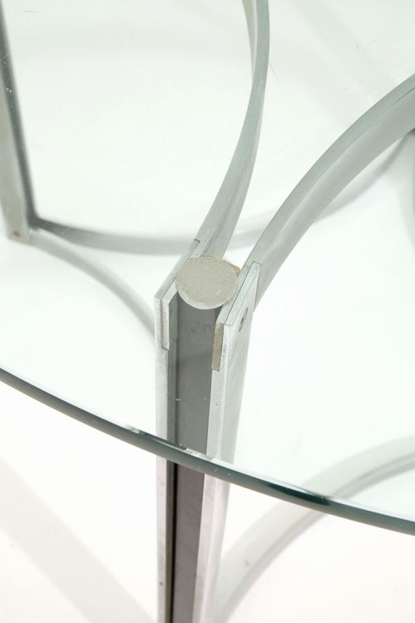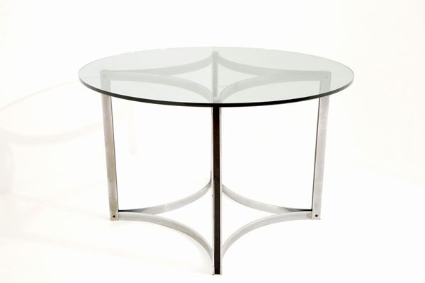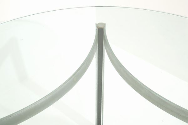 Round table in chromed steel and iron with glass top. 20th century. Signs of wear.