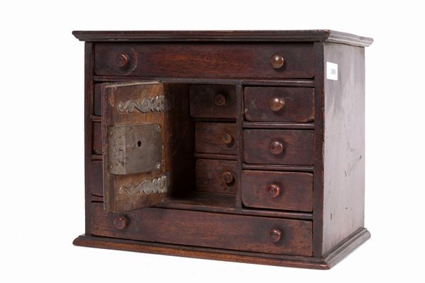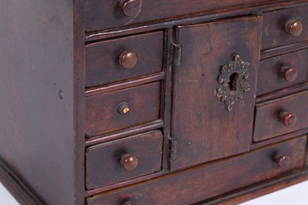 Small coin cabinet in walnut with drawers. XVIII century.