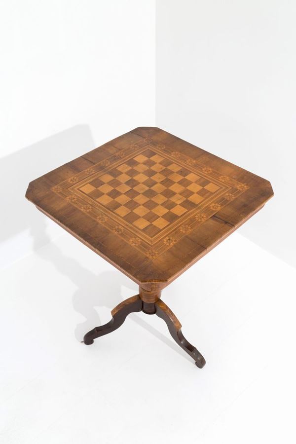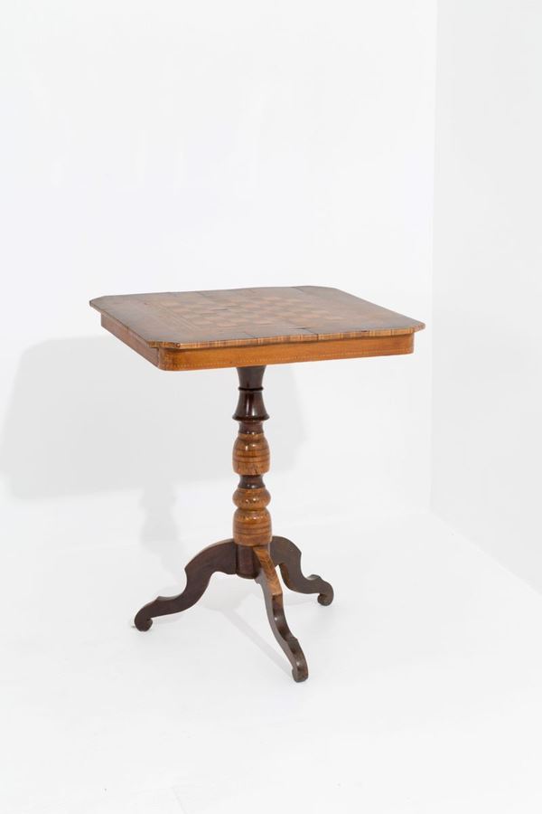 Coffee table in various inlaid woods, square top with checkerboard and tripod base. Sorrento. Nineteenth century.