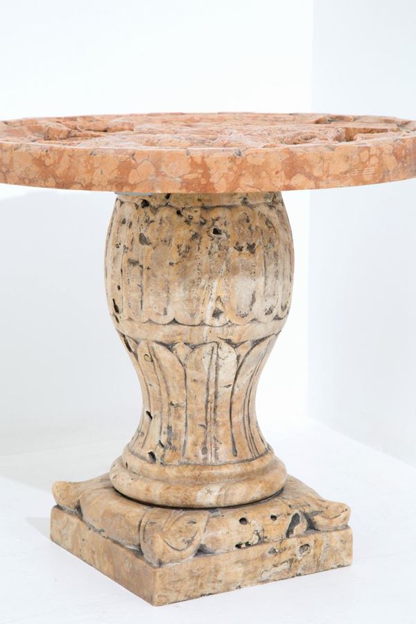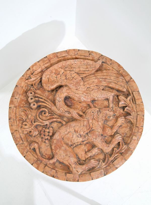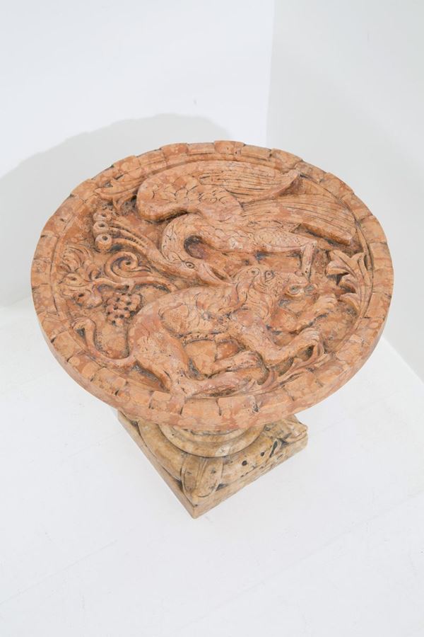 Red Verona marble coffee table with round bas-relief top raff. "FANTASTIC ANIMALS". & Nbsp;