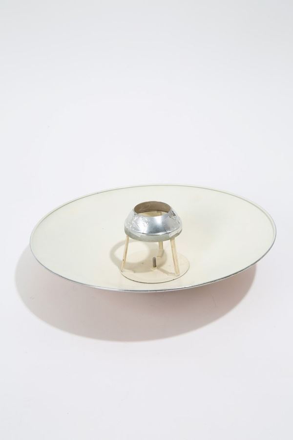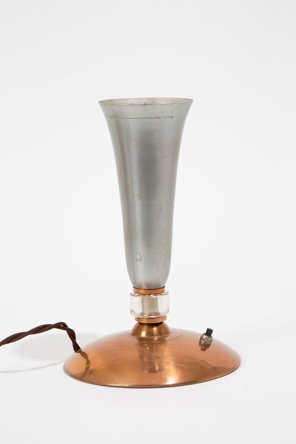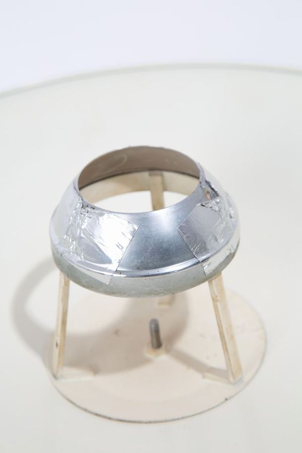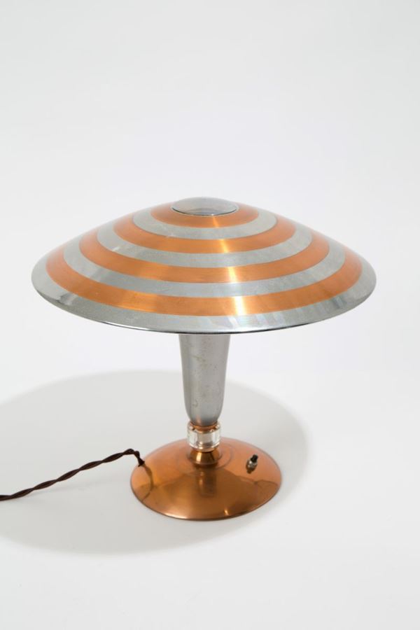 Table lamp in chromed and enamelled steel with striped lampshade. 70's. Slight flaws.
