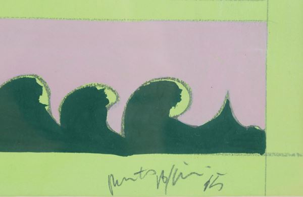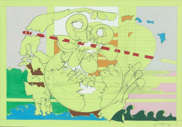 Tempera painting on raff paper. '' ABSTRACT SUBJECT ''. Signed and dated '65 lower right. In frame.