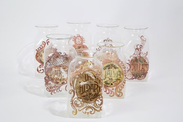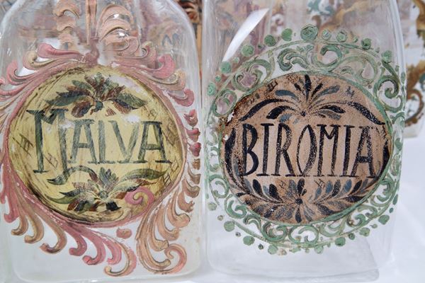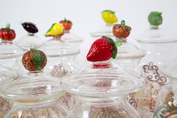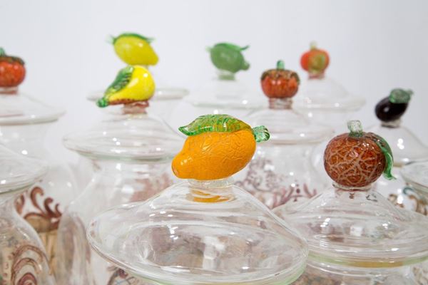 Twelve blown glass apothecary jars with decorations and names of medicinal herbs with fruit-shaped lid handles. Various measures.