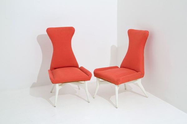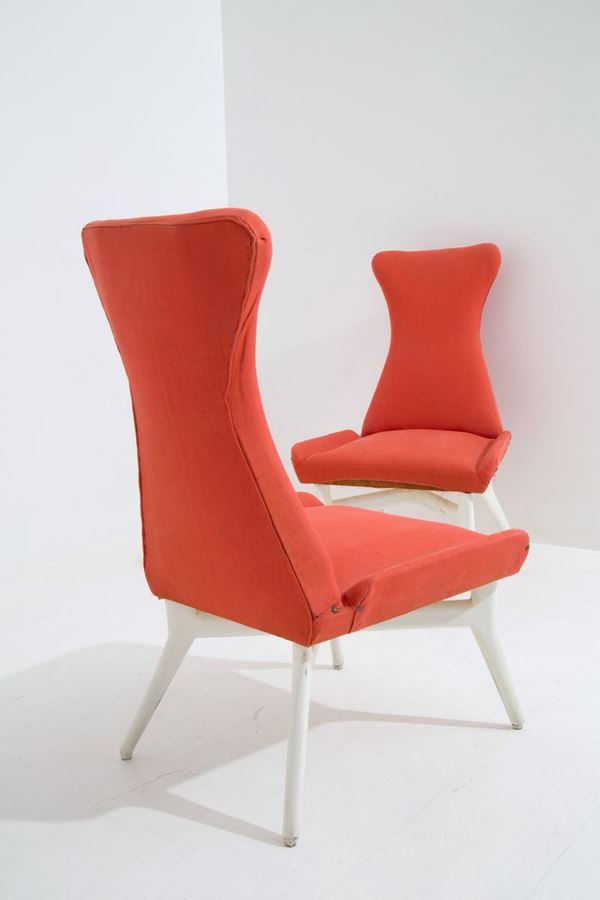 Two armchairs in white lacquered wood and heavy-colored fabric. Italian manufacture. 70's.