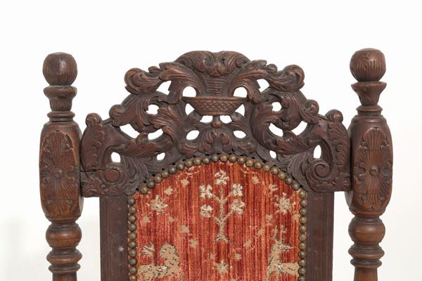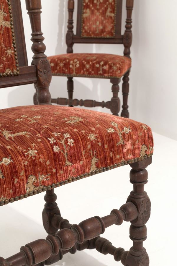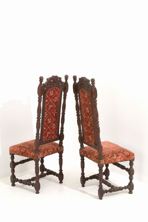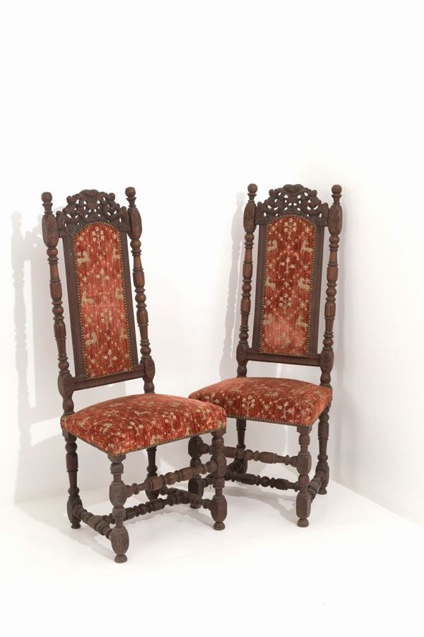 Two carved oak chairs with turned legs. Holland. Nineteenth century.