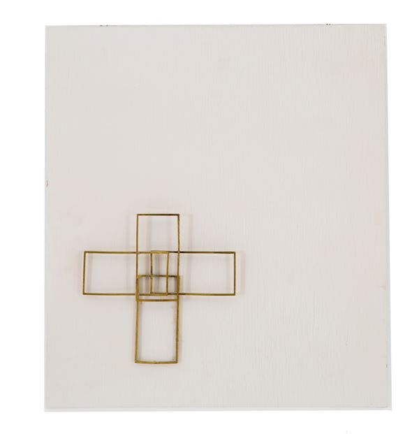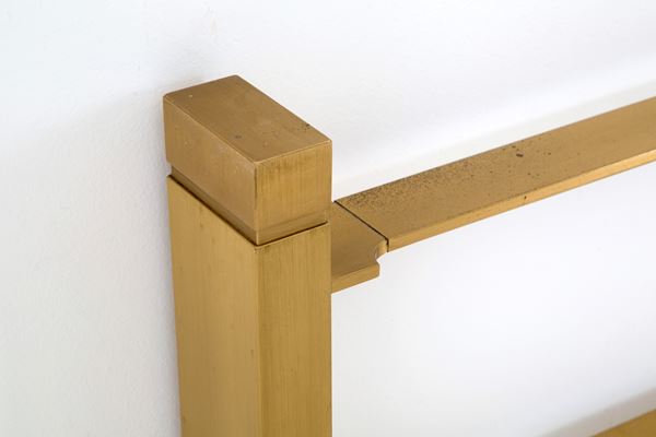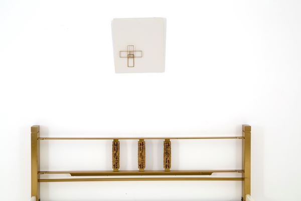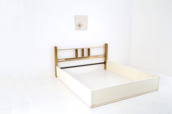 Double bed with brass and bronze crucifix. The headboard is enriched by sculptures in hammered and gilded bronze. 70's. Slight wear of time.