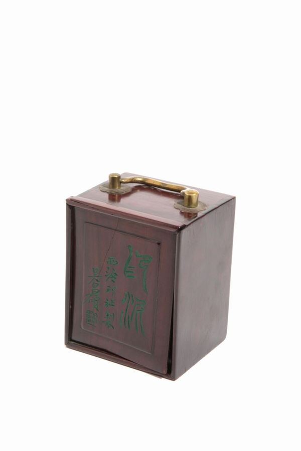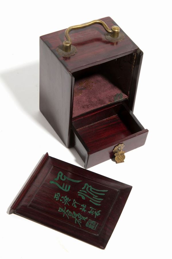 Small wooden box with sliding door and internal drawer depicting with oriental characters. China.