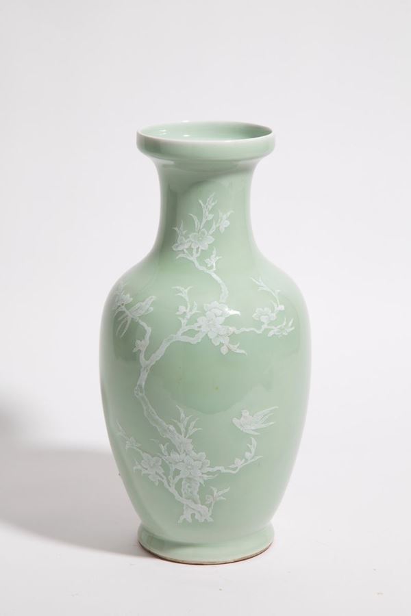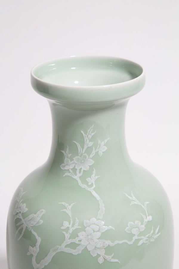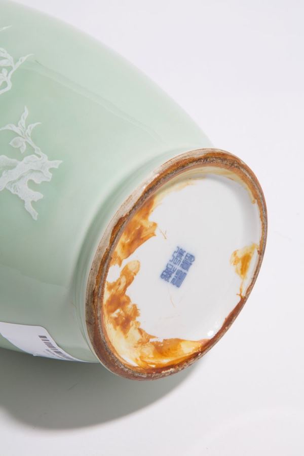 Celadon porcelain vase with white floral motifs. Brand on the bottom. China. Small felatura.