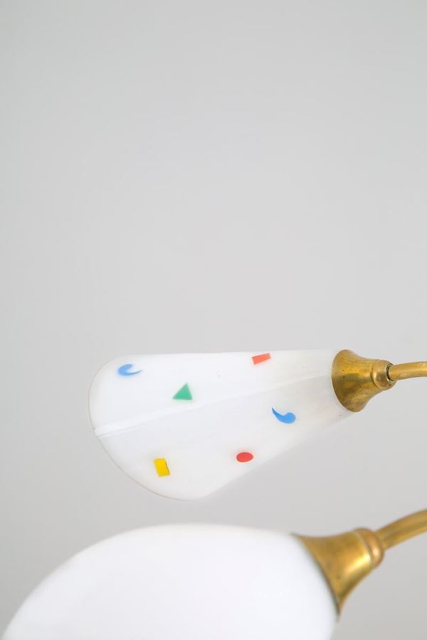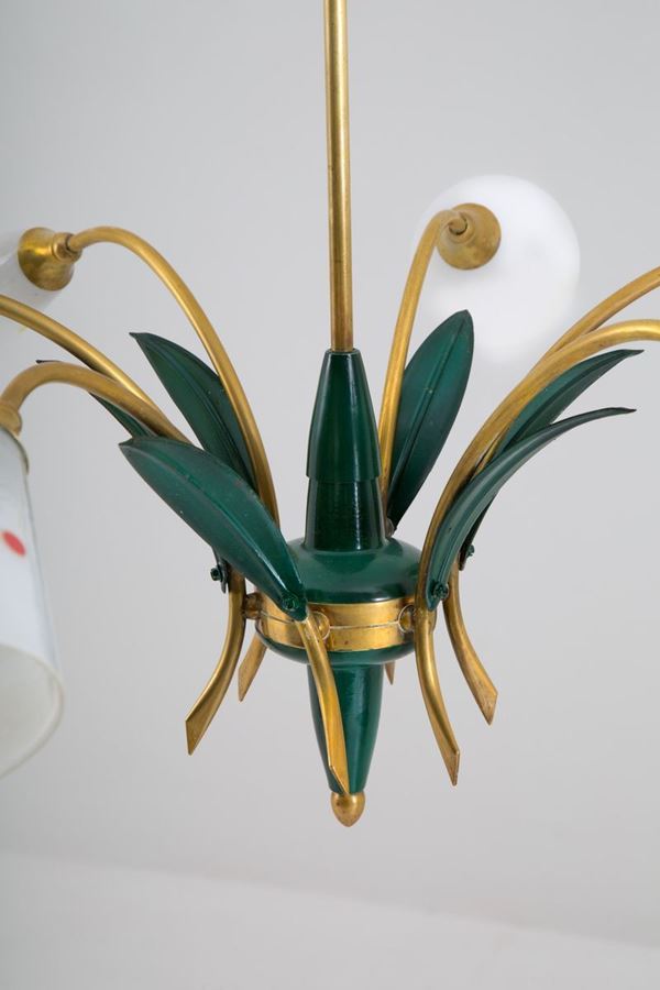 Chandelier in brass and polished and satin glass with colored geometric motifs. 1950s.