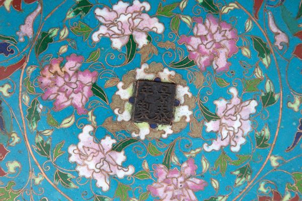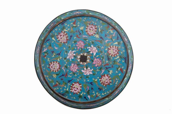 Cloisonné bronze tray with floral motifs. Signed on the bottom. China. Nineteenth century.