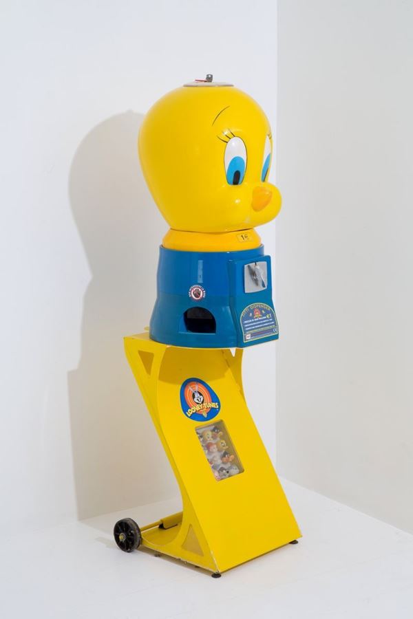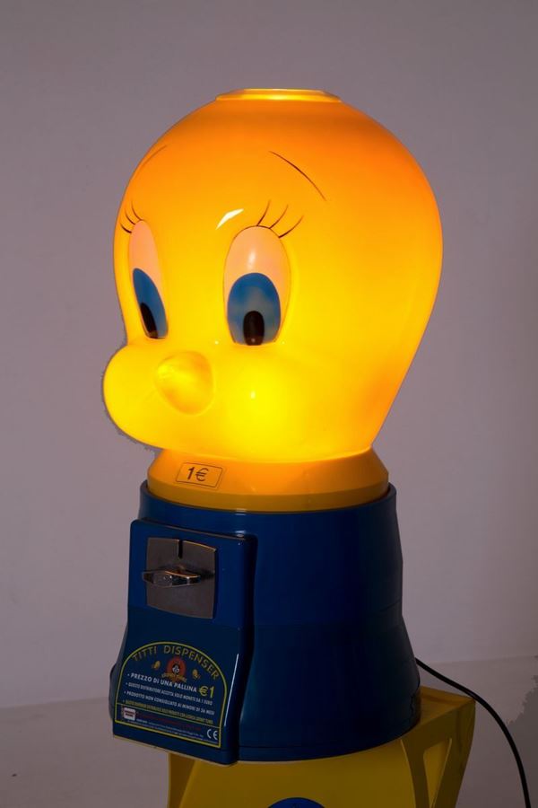 Automatic dispenser of balls for children in plastic and metal depicting "TITTI".