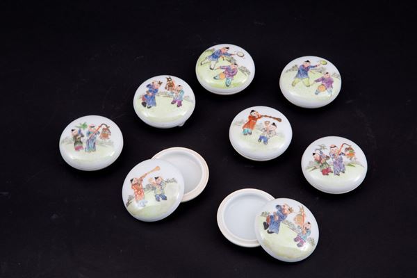 Eight rectangular porcelain boxes with lid depicting "ORIENTAL LIFE SCENES". Mark on the bottom. China.